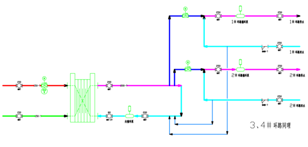 热力站分布式供热系统二次侧循环系统分为内循环和外循环两个系统,内循环系统只负责换热器二次侧与一次侧的换热循环,外循环系统负责所在环路用户侧的散热循环,两个循环通过平衡管(耦合罐)进行热量交换。该系统的优点是内、外循环系统和各环路间水力工况相对独立、互不干扰,依据需求调整相应的循环泵频率就可以实现各自流量精准控制以及参数的差异化调节;每台循环泵的扬程仅满足各自回路系统阻力即可,一般都在10m以内。分布式供热系统非常适合于环路较多、环路间负荷及阻力差异较大、各环路供热参数需求不同的系统,其灵活的调节性不仅能解决各环路供热参数调节难、分配难的问题,还能起到节约电耗的效果。